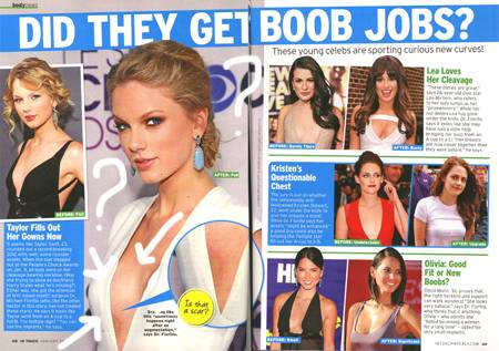 According to various news sources, Taylor Swift might of had a possible boob job. Lets face it she’s 23 and from what I’m hearing in class, most women are done developing breasts long before this age. It’s also obvious that her breast cleavage has went up a size.